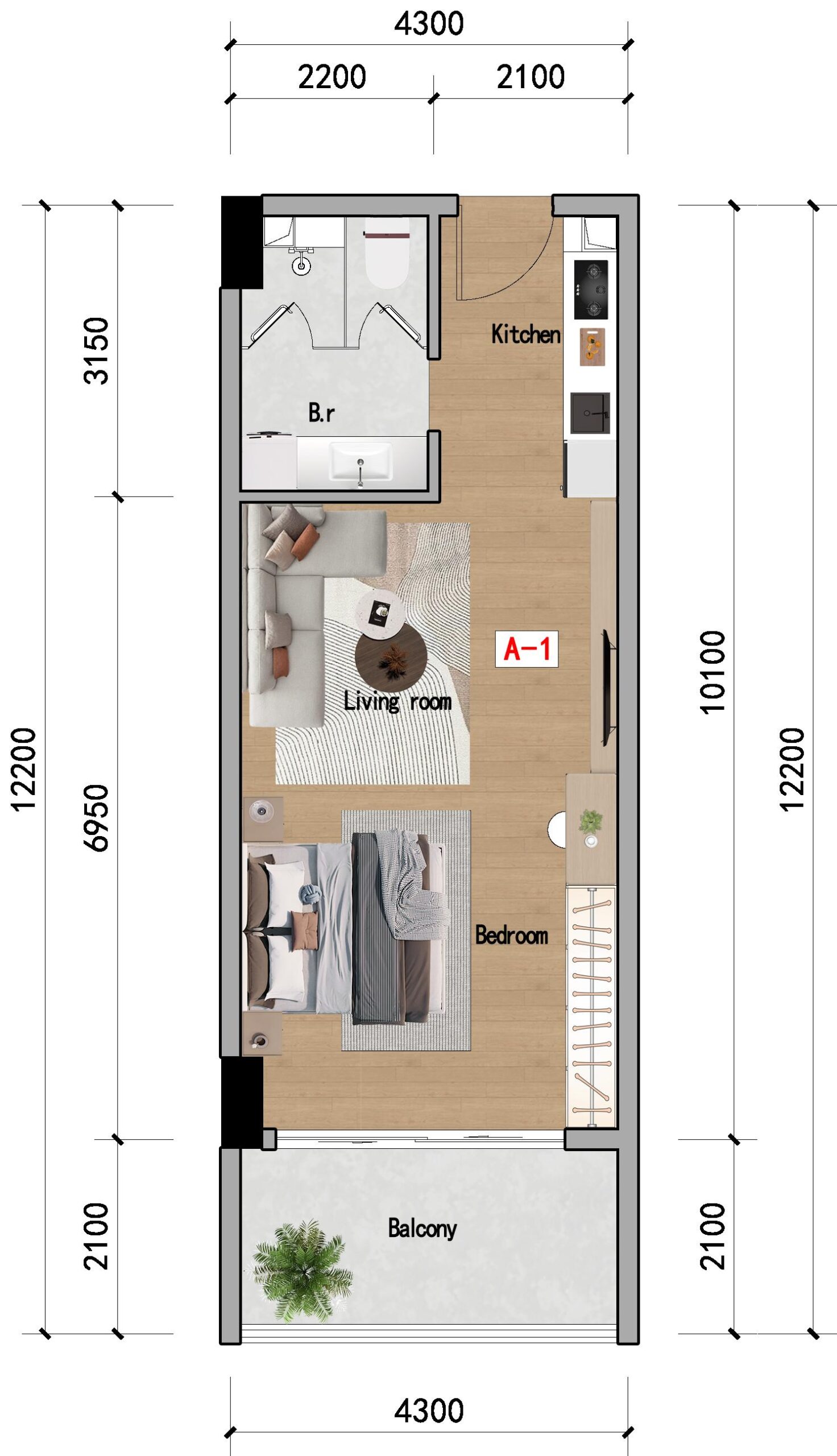 Our studio floor plan maximizes space and comfort, featuring an open living area that flows onto a private balcony. Large glass doors frame sweeping Kigali views, filling the apartment with natural light. Ideal for investors, the design blends elegance, practicality, and an unbeatable connection to the city’s skyline.